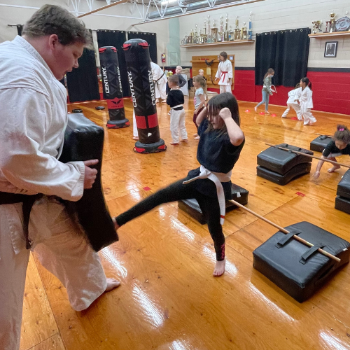 The curriculum includes basic strikes, blocks, stances, kata, light point sparring, weapon sparring, and age-appropriate self-defense. We discuss how to recognize “bad guys,” when it’s appropriate to use their skills, and the importance of conflict resolution. Our dojo provides a safe, supportive space for kids to try new things, build confidence, and do their best.